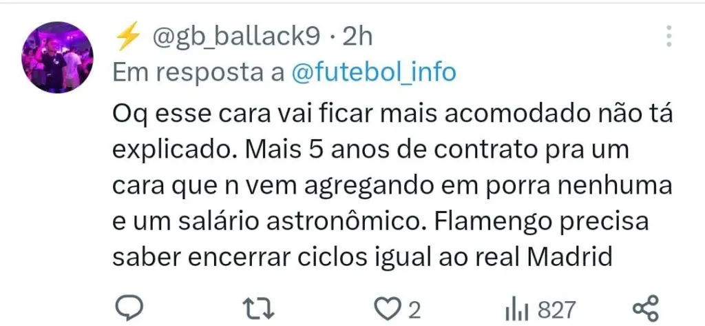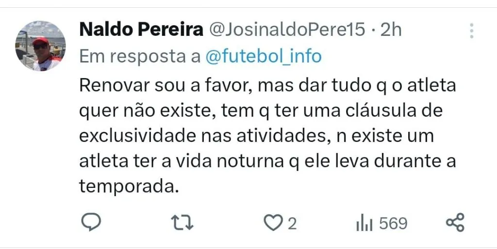 Há ainda aqueles que aprovam a renovação, mas criticaram o tempo do novo contrato. “Dar um aumento salarial e bonificação é insano, o Gabi caiu muito de rendimento. Dentro de uma realidade responsável era manter o salário e no máximo dois anos de contrato. 🔴⚫🔥”, declarou um torcedor.