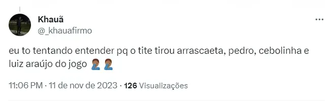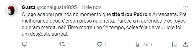 A maioria com comentários de que não havia o porquê Tite tirar Pedro naquele momento do jogo, ainda mais para dar lugar a Gabigol, que vive um seca de gols intermináveis no Flamengo. Confira os comentários abaixo.