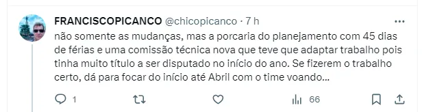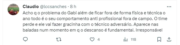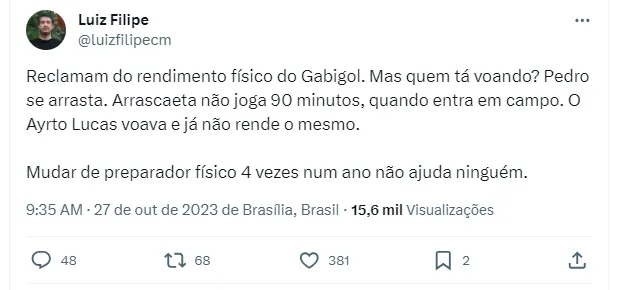 “Reclamam do rendimento físico do Gabigol. Mas quem tá voando? Pedro se arrasta. Arrascaeta não joga 90 minutos, Ayrton Lucas voava e já não rende o mesmo. Mudar de preparador físico quatro vezes num ano não ajuda ninguém”, disse um torcedor.