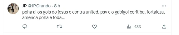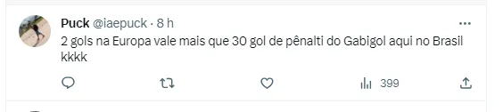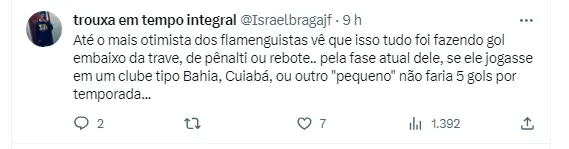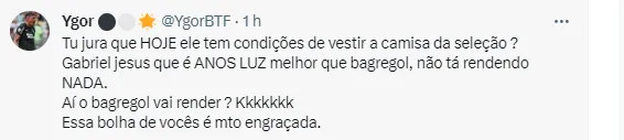 “Qualquer um que jogasse contra Boa Vista, Volta Redonda e Bangu ia ter esses números, irmão”, opinou um torcedor pelo Twitter. Outro foi na mesma linha: “Só existe uma pequena diferença entre jogar com o Goiás e jogar contra o Uruguai, mas tirando essa PEQUENA diferença tá ok”, completou. Por fim, um internauta falou do rendimento atual do atacante: “Gabriel? Seis últimos jogos e um CHUTE. Marcos Leonardo, Tiquinho, Pedro ou Vitor Roque (para ser convocado), escolhe”, disse.
