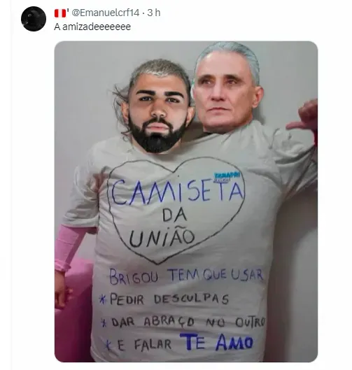 Também houve muitos adeptos que não perderam a oportunidade de brincar e publicaram muitos memes, afirmando que o jogador pediu desculpas pelas suas falas em 2022. Um internauta acabou simulando o que Gabi disse na hora do reencontro com Tite: “Era brincadeira, humor. Por favor, não me faz mofar no banco”, brincou. Outro acabou celebrando o encontro e ironizou a paz entre os dois: “Mais que amigos, friends”, completou.