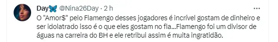 Outro acabou indo na mesma linha: “Ídolo. Mas muito arriscado três anos e com um salário desse. Eu fecharia por dois anos e com metas que pudesse chegar nesse salário. Não entraria em leilão”, comentou. Por fim, um adepto do Flamengo disse que ele deveria ter mais gratidão pelo Clube Carioca: “Ficou um ano recebendo sem jogar, deveria ter consideração com o Clube, mas três anos com esse salário eu não daria. O Flamengo é maior que qualquer um jogador desse elenco mimado!”, completou.
