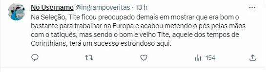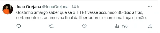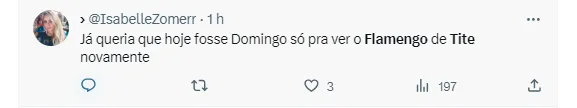 Houve ainda quem deixou clara a empolgação com o a decisão do treinador em bancar Pedro no lugar de Gabigol também foi alvo de comemorações: “Pedro indo comemorar com o Tite e ele apontando pro campo. Eu estou muito iludido”, disse outro usuário. O número de gols de Pedro sendo dirigido por Tite também foi alvo de comentários de adeptos do Mais Querido: “O que esse cara vai fazer gol com o Tite é uma brincadeirinha”.