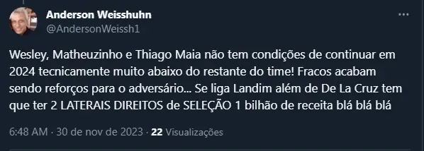Dentre eles, nomes como Thiago Maia, Matheuzinho e Wesley foram os principais alvos da Nação. Inclusive, por mais que a lateral seja uma opção carente no mercado, os jogadores entraram em uma “lista de dispensa” de vários torcedores.