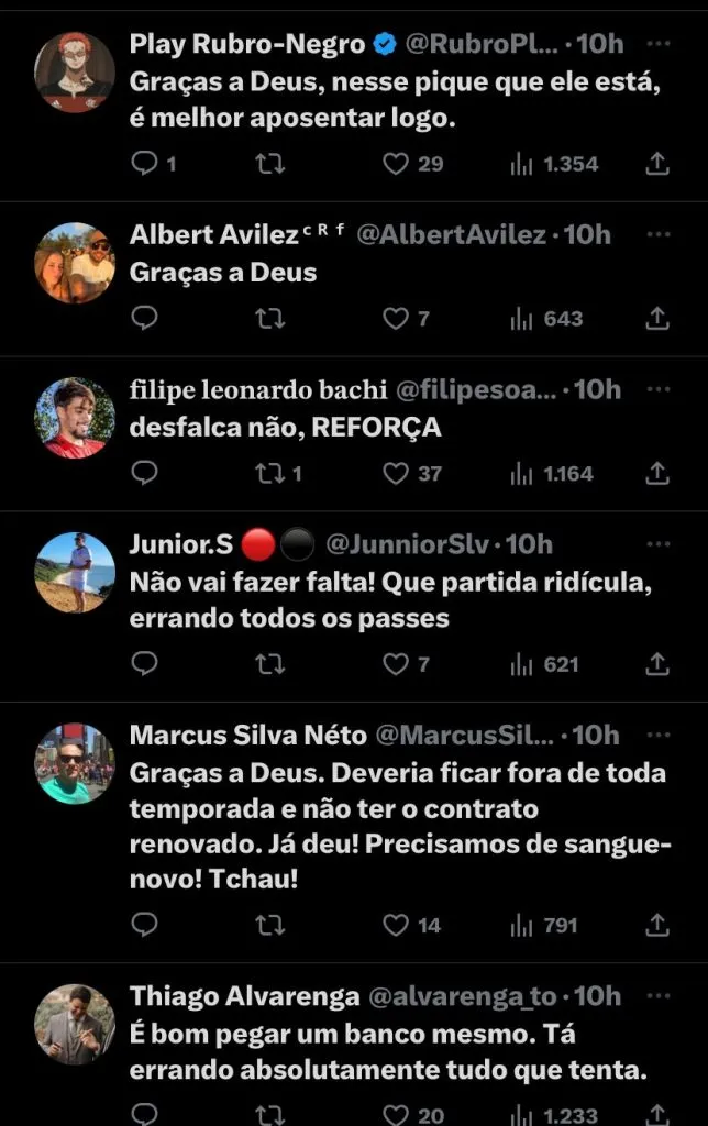 Nas redes sociais, a torcida do Flamengo agiu de forma diferente com a ausência do atleta, uma boa parte até ‘comemorou’, afirmando que ele em campo seria reforço para o Santos: (SIC) “Graças a Deus, nesse pique que ele está, é melhor aposentar logo”; “Desfalque pro Santos”; “Graças a Deus. Deveria ficar fora de toda temporada e não ter o contrato renovado. Já deu! Precisamos de sangue novo! Tchau!”, foram os comentários da Nação.