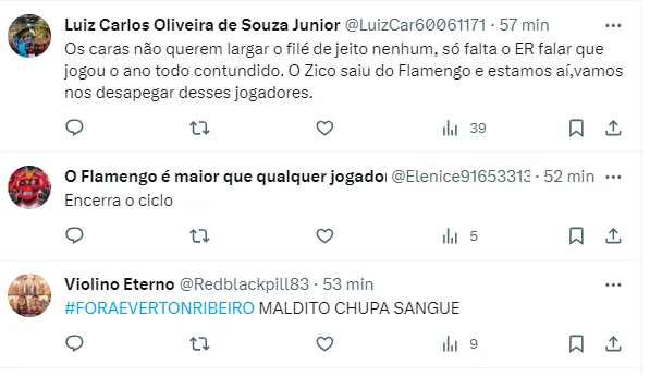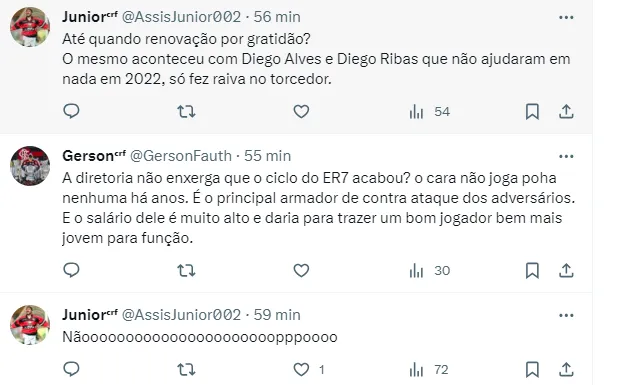 Pelo Twitter, boa parte dos torcedores não estão nada satisfeitos com a possibilidade do camisa 7 continuar no Rubro-Negro do Rio de Janeiro. O argumento é de que o ciclo dele passou e que a tendência é que ele renda pouco na equipe.