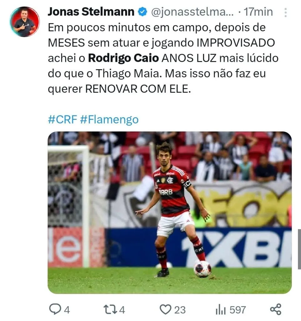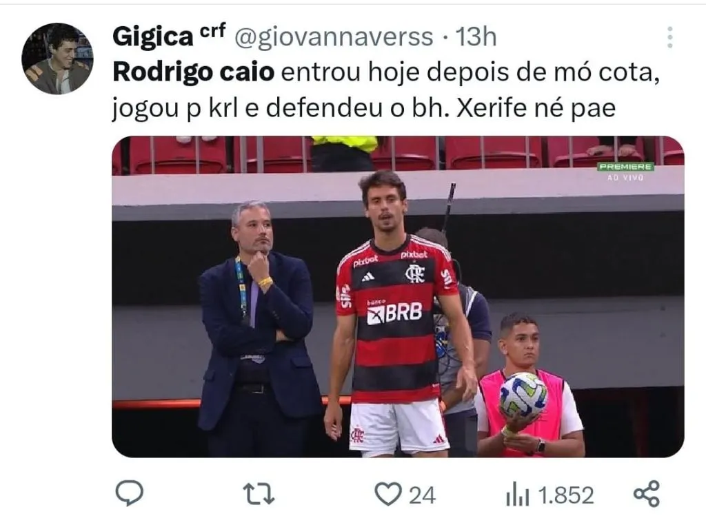 “Cara, por incrível que pareça, a única coisa boa do jogo ontem, foi à entrada do Rodrigo Caio. Espantosamente, ele como volante, fez o Flamengo jogar organizadamente, e com toques rápidos, e com objetividade, em direção ao gol, aprovei demais. #GRAÇASADEUSRODRICOCAIOVOLTOU”, avaliou outro.