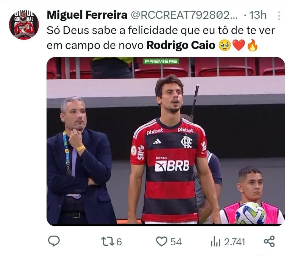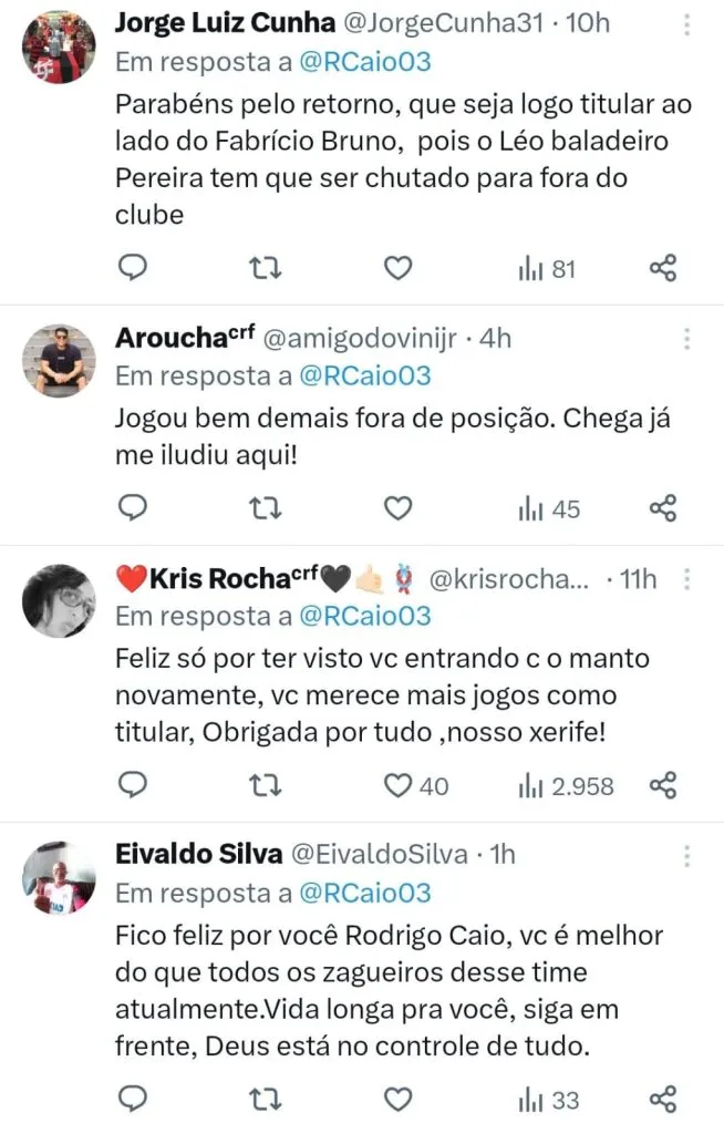 “Para a minha felicidade em um jogo ridículo do @Flamengo ontem, e saber que o brabo voltou, @RCaio03 parabéns pela sua volta, estava aqui torcendo para te ver novamente em campo… “, comemorou um torcedor rubro-negro.