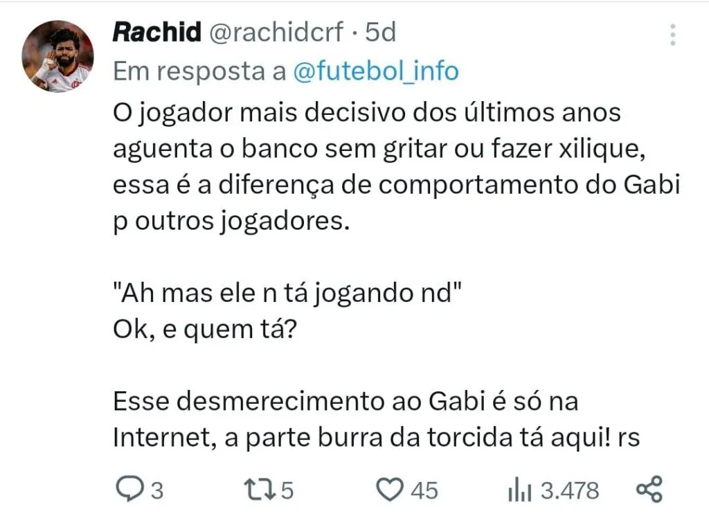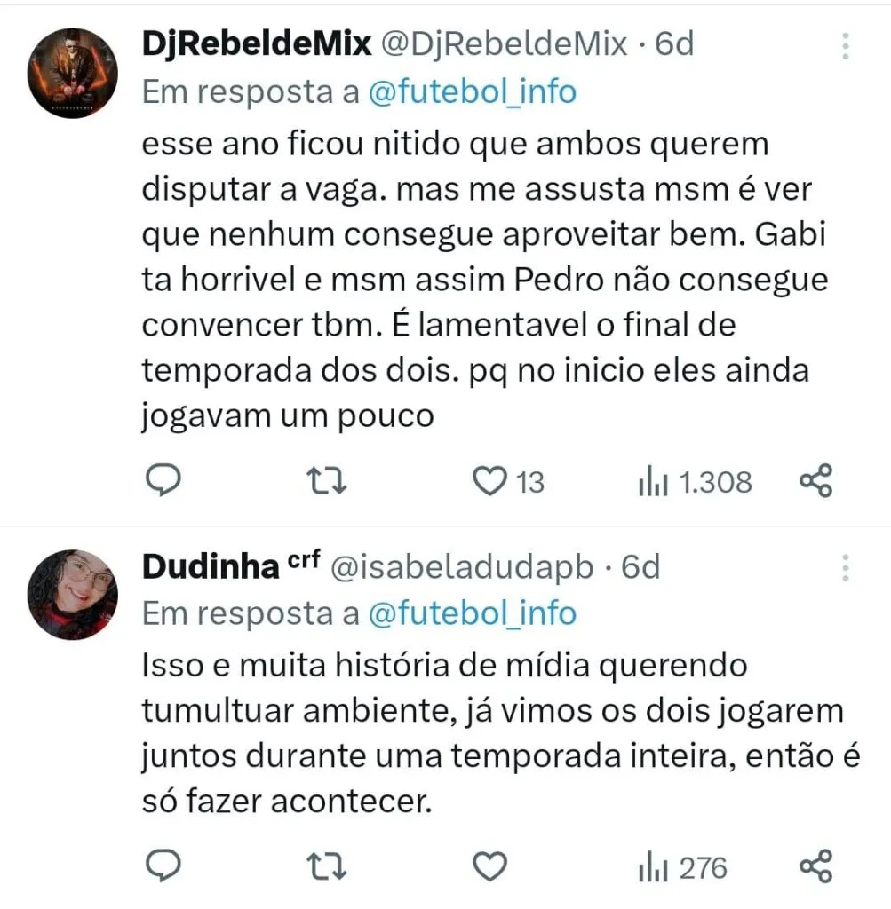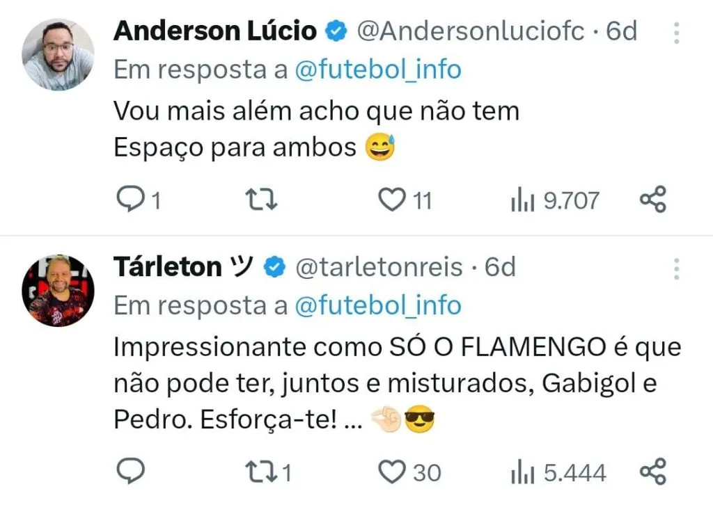 “Primeiro q o gabigol nunca deu NADA ao Flamengo, ele que tem q agradecer e muito por ser horrível e ter um time q o eleva a esse status de decisivo. Segundo o Pedro joga EM QUALQUER TIME BRASILEIRO, já o lil Gabi é quase impossível… fora q um é muito mais habilidoso q o outro”, defendeu um torcedor. “E obviamente isso é alimentado pelo mimado e chorão do Pedro. Gabigol até de posição mudou pro chorão se encaixar. Ele, que vai pro banco, dá piti. Coisa que não fazia na Itália.”, disse outro defendendo Gabigol.