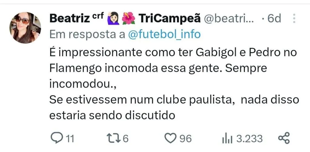 “Quem não consegue lidar com os dois no Flamengo é a mídia. Desde que Pedro chegou que tentam tirá-lo daqui a todo custo. Agora tem que mandar um embora pq o outro chora quando fica no banco? Me poupe né. Não sabem mais o que inventar.” Postou uma internauta.