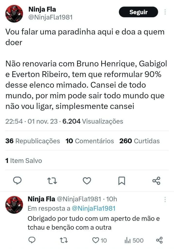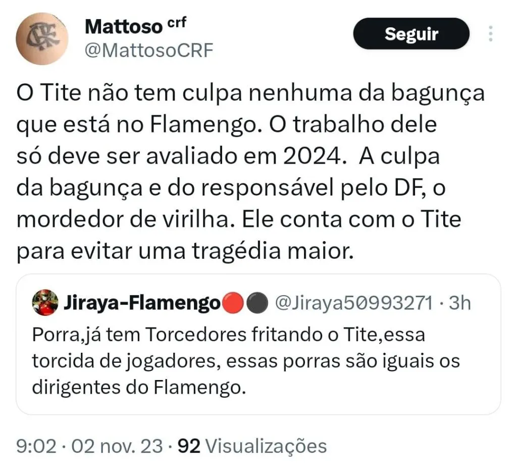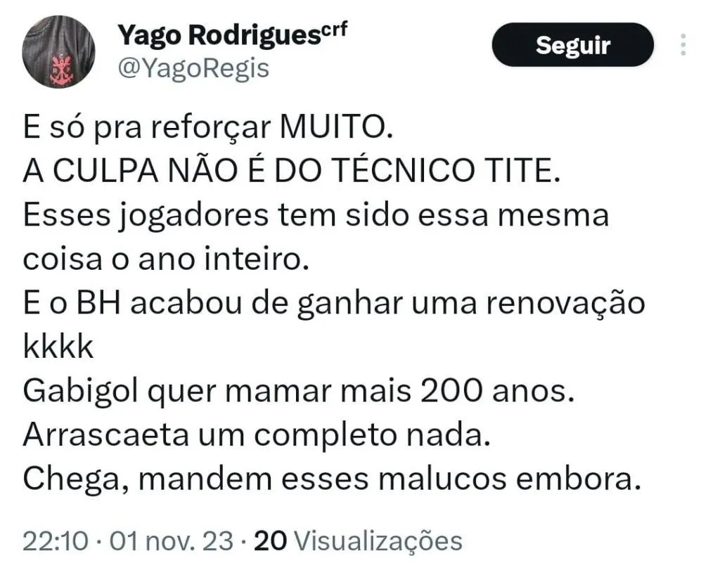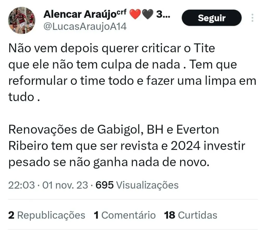 “Não vem depois querer criticar o Tite que ele não tem culpa de nada. Tem que reformular o time todo e fazer uma limpa em tudo. Renovações de Gabigol, BH e Everton Ribeiro tem que ser revista e 2024 investir pesado se não ganha nada de novo.”, postou um torcedor.