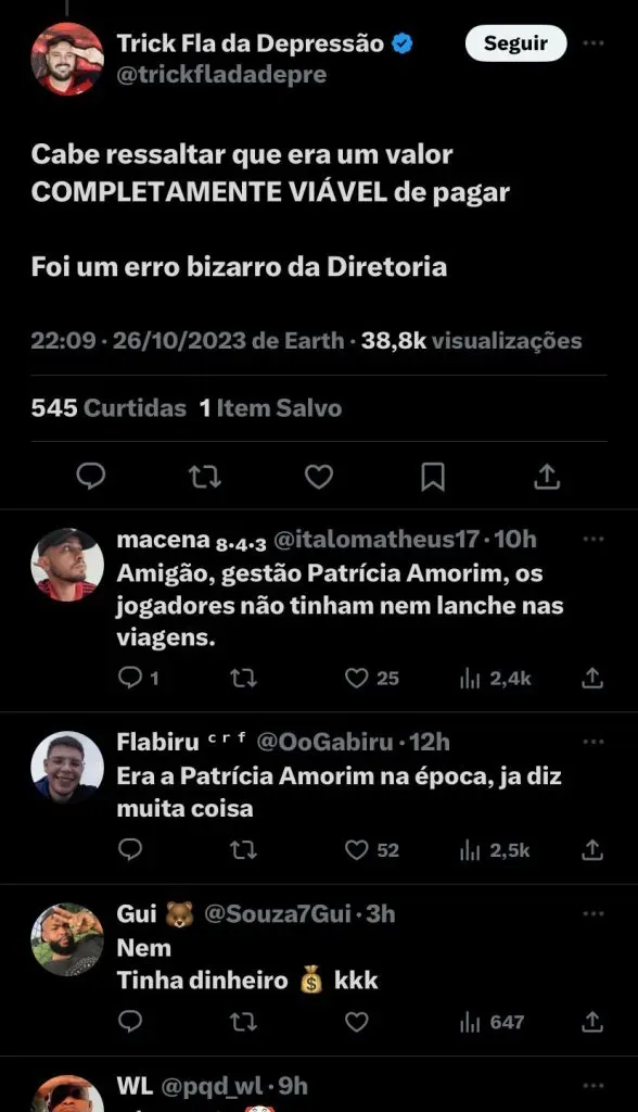 Após a declaração, a torcida do Flamengo lamentou o jogador não ter ficado por mais tempo na Gávea na época, culpando principalmente a gestão da ex-presidente do Clube, Patrícia Amorim: (SIC) “Cabe ressaltar que era um valor COMPLETAMENTE VIÁVEL de pagar. Foi um erro bizarro da Diretoria”; “Era a Patrícia Amorim na época, já diz muita coisa”; “Ele foi uma peça fundamental para o Bonde do Mengão Sem Freio! Jogou muito”, foram alguns comentários da torcida do Flamengo.