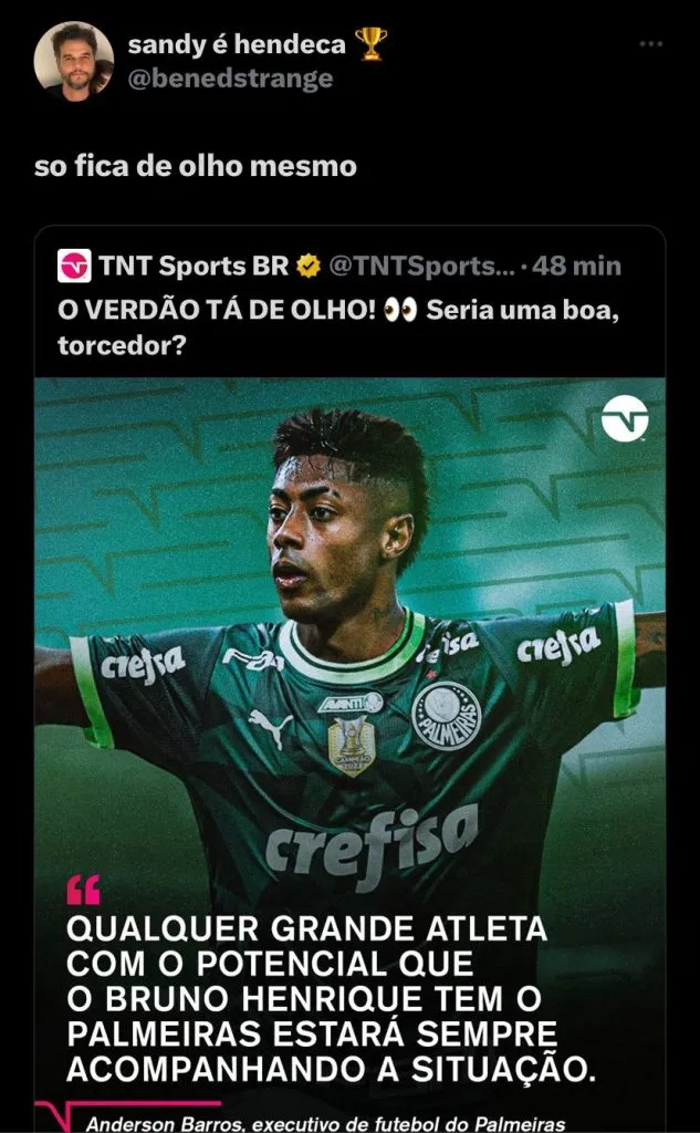 Com isso, a maioria dos palmeirenses acham uma falácia, que o Clube está ‘usando’ Bruno Henrique como escudo: (SIC) “Estou de luto ainda e esse cara querendo colocar cortina de fumaça”; “Vai ser uma cortina de fumaça daqui até o início da próxima temporada com várias especulações de bons jogadores, no final não vai vir ninguém ou vem 2 bagres”, foram os comentários da torcida do Palmeiras que não acredita em uma possibilidade do BH fechar com o time.