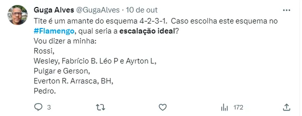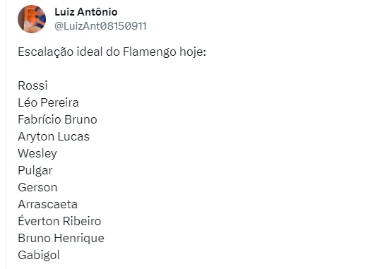 Para o confronto, uma provável escalação tem: Rossi, Wesley, Pablo, Léo Pereira e Ayrton Lucas; Thiago Maia, Pulgar, Gerson e Arrascaeta; Cebolinha (Bruno Henrique) e Pedro. No entanto, pelo Twitter, alguns torcedores do Mais Querido resolveram dar seus palpites a respeito de qual seria a escalação ideal do Clube Carioca para o resto da temporada. Um nome em específico acabou surpreendendo.