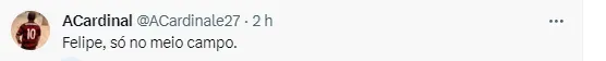 Um torcedor acabou indo na mesma linha e revelou que o Flamengo não pode cogitar a hipótese de renovar com Filipe Luís. Afinal, o camisa 16 não rende mais o mesmo de outros tempos: “Filipe Luís não dá mais, não. O Flamengo tem que contratar outro lateral-esquerdo”, disse. Por fim, um usuário da rede social indagou a respeito de um suposto plano da diretoria para 2024: “E a tal reformulação?”, questionou.