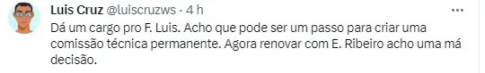Pelo Twitter, houve torcedores que deixaram claro serem contrários a essa ideia: “Cara o Everton Ribeiro tudo bem, renova por mais um ano e segue o baile. Agora, o Felipe Luis é obrigado e tchau, Faz uma homenagem merecida e vamos em frente”, opinou um internauta. Outro disse que só vale a pena manter Filipe Luís na comissão técnica: “Dá um cargo para o Filipe Luis. Acho que pode ser um passo para criar uma comissão técnica permanente. Agora, renovar com Everton Ribeiro acho uma má decisão”, completou.