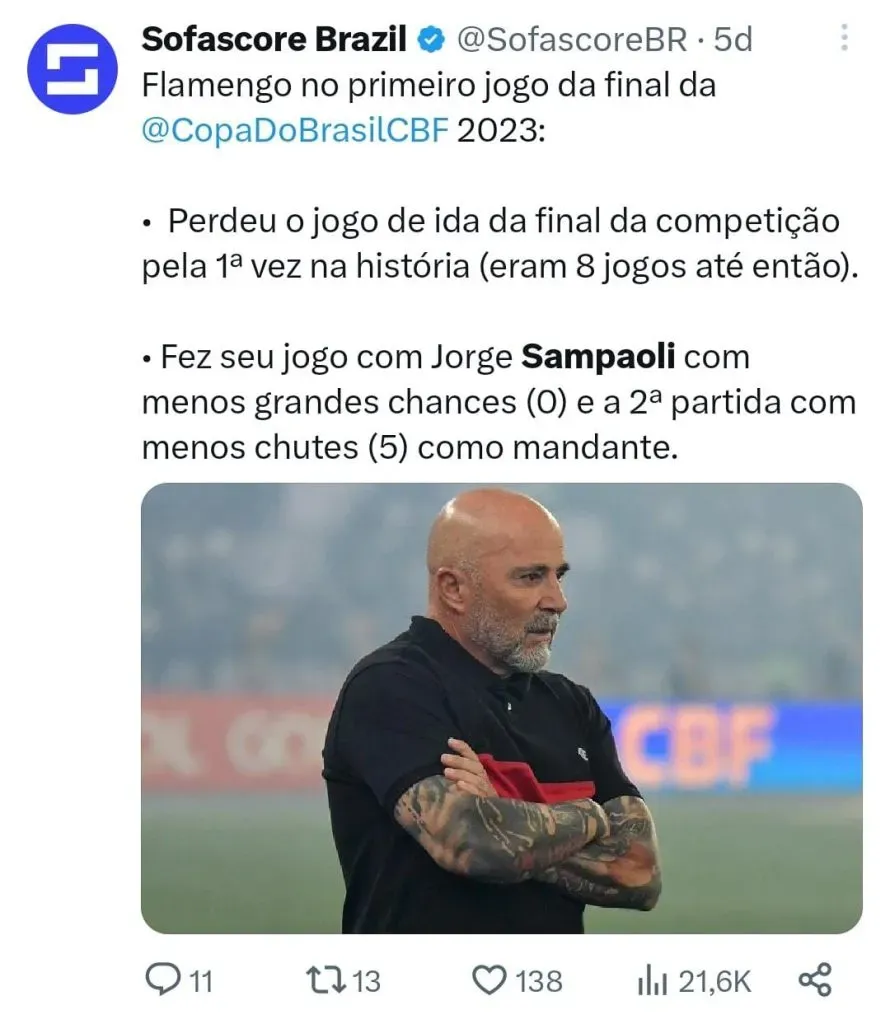 Diante desse cenário, a saída do técnico é tida como garantida. Mas o que era esperado para o fim da temporada pode vir a acontecer ainda neste fim de semana. Caso o Flamengo perca o título da Copa do Brasil para o São Paulo no domingo, o técnico argentino dificilmente irá resistir no cargo, não apenas pela falta de títulos, mas pela falta de controle e de ambiente para seguir na Gávea. A própria diretoria do Clube está rachada quando o assunto é Sampaoli que tem em Rodolfo Landim a sua base de sustentação, já Marcos Braz e outras personalidades da cúpula do Flamengo querem a saída do argentino há algum tempo. Sendo assim, perder o último título possível do ano deve ser o pingo d’água para determinar o fim do ciclo de Sampaoli.
