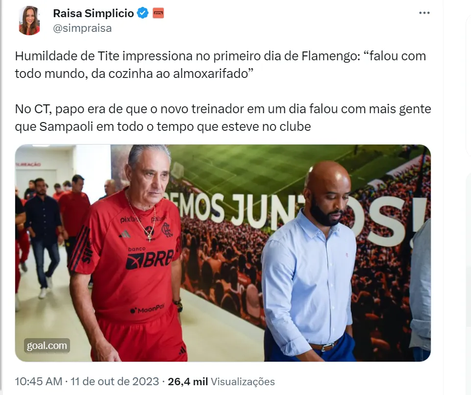 Após dez meses fora do futebol, Tite assumiu o comando do Flamengo e iniciou os trabalhos na última terça-feira (10), no CT do Ninho do Urubu. O ex-treinador da Seleção Brasileira assinou com o Mengão até dezembro de 2024 e chegou ao Clube da Gávea com os auxiliares Matheus Bachi, Cléber Xavier e César Sampaio, além do preparador físico Fábio Mahseredjian e o analista de desempenho Lucas Oliveira.