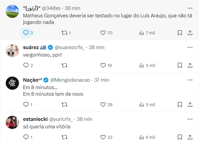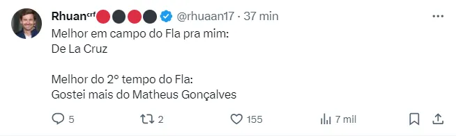 Torcedores nas redes sociais avaliam que foi um jogo ruim da equipe do Flamengo, mas com destaques a De La Cruz e Matheus Gonçalves, que entrou no segundo tempo.