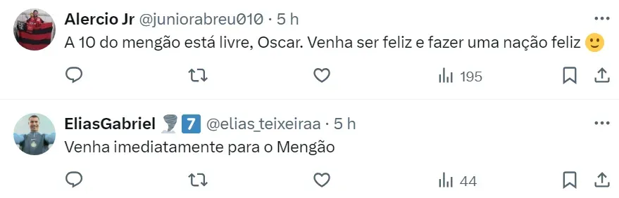 Na publicação de Oscar no X, os torcedores do Flamengo encheram de comentários para o meio-campista assinar com o Rubro-Negro e outros afirmaram que a camisa 10 lhe espera.