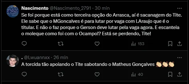 De acordo com ‘Flazoeiro’, Tite decidiu não relacionar Matheus Gonçalves para a partida diante do Atlético-GO. Até o momento, o motivo pela exclusão não foi divulgado.