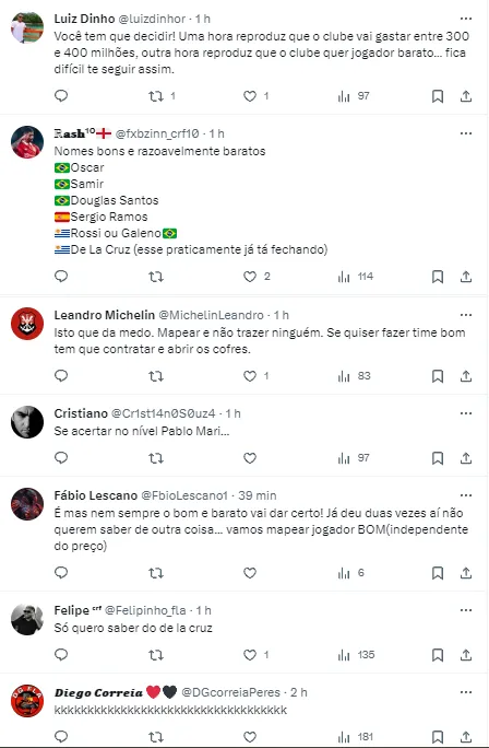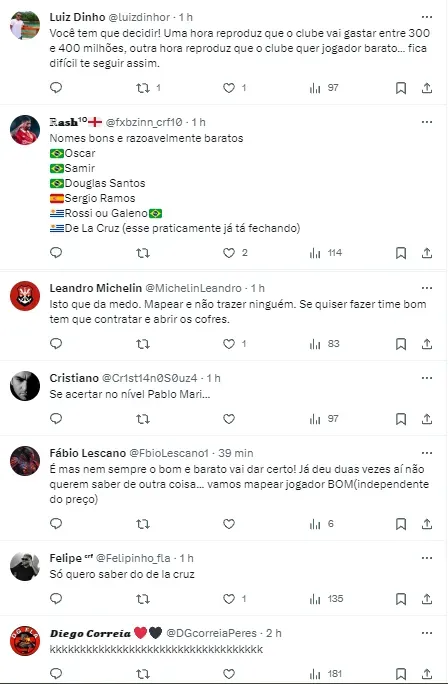 Na web, a informação agitou a torcida. Enquanto alguns reclamaram sobre a busca de um perfil mais barato, outros trataram de fazer listas com opções no mercado. Um perfil citou nomes como do meia Oscar, do zagueiro Samir, do lateral Douglas Santos e outros.