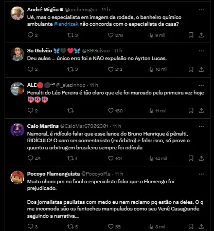 Uma das principais reclamações foi sobre a penalidade dada no final do jogo que deu a vitória para o Mengão. Na jogada, Bruno Henrique é atingido por uma cotovelada dentro da área e o atacante até mostrou que teve um corte na boca.