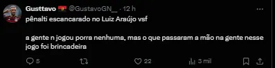 Na jogada, a crítica foi que o atacante Luiz Araújo teria sido derrubado pelo adversário Vitinho. Para o comentarista, a arbitragem e o VAR erraram em não assinalar a infração, pois o contato é faltoso.