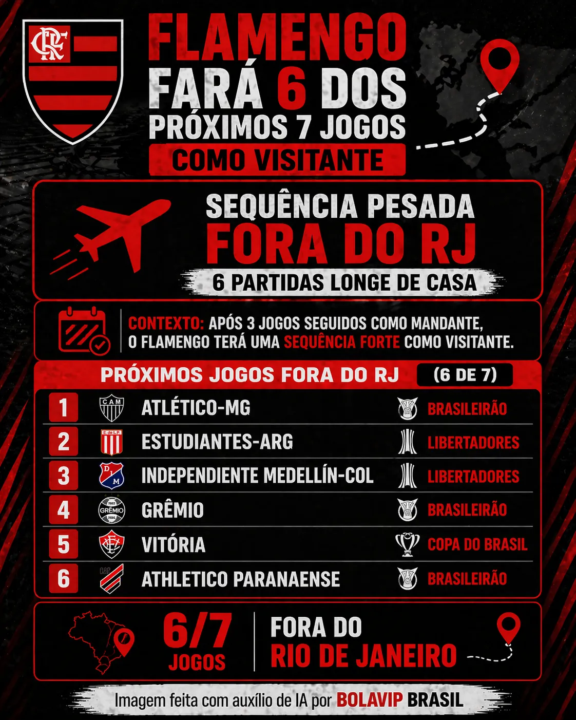 Para encerrar, após atuar três jogos seguidos como mandante, o Flamengo vai encarar uma sequência impressionante pela frente. Dos próximos sete jogos, seis vão acontecer fora do RJ. São eles: Atlético-MG (Brasileiro), Estudiantes-ARG (Libertadores), Independiente Medellín-COL (Libertadores), Grêmio (Brasileirão), Vitória (Copa do Brasil) e Athletico Paranaense (BR).