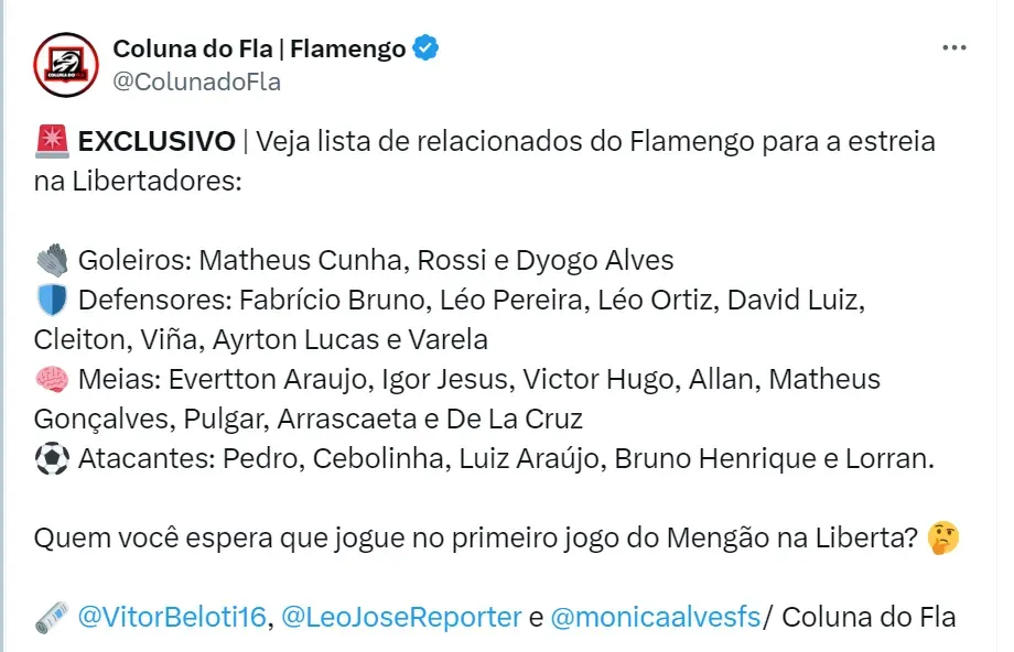 Apesar de ter um elenco estrelado, o Mengão também vem dando espaço para a base e relacionou alguns jovens para o jogo da Libertadores. São os casos do zagueiro Cleiton, dos meio-campistas Evertton Araujo, Igor Jesus, Victor Hugo e Matheus Gonçalves e o atacante Lorran.