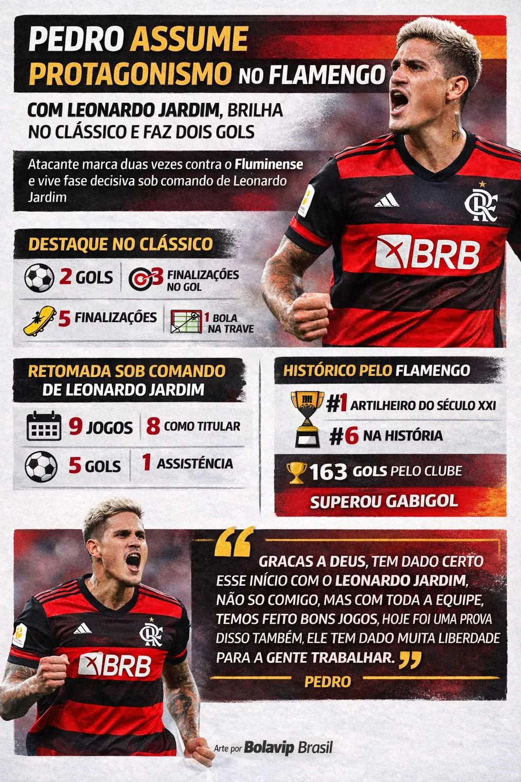 Além da fase atual, Pedro também alcançou uma marca histórica com a camisa do Flamengo. Com os dois gols no clássico, chegou a 163 gols e se tornou o maior artilheiro do clube no século XXI. O atacante também entrou para o top 6 da história rubro-negra. Os números consolidam sua importância.