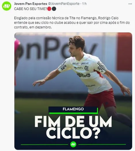 Segundo publicação da Jovem Pan Esportes, Rodrigo Caio não quer mais permanecer no Flamengo, justamente, pelo fato de não ter conseguido reconquistar seu espaço, condição que o acompanha desde que Vítor Pereira passou pelo Mais Querido, bem como, quando Sampaoli treinava a equipe. De acordo com o tradicional veículo paulista, o zagueiro está decidido a encerrar seu ciclo Rubro-Negro e se movimenta para encontrar uma nova equipe.