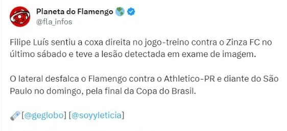 Segundo informações do GE, Filipe Luís sentiu a coxa direita no jogo-treino contra o Zinza FC no último sábado (9)e teve a lesão detectada em exame de imagem. O lateral desfalca o Flamengo contra o Athletico-PR e diante do São Paulo no domingo, pela final da Copa do Brasil.