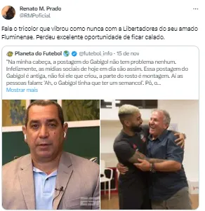 Porém, o jornalista Renato Maurício Prado fez questão de rebater o ex-jogador, alegando que ele torce para um rival do Fla e perdeu a oportunidade de ficar calado. “Fala o tricolor que vibrou como nunca com a Libertadores do seu amado Fluminense. Perdeu excelente oportunidade de ficar calado”.