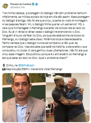 “Aí as pessoas falam: ‘Ah, o Gabigol tinha que ter um semancol’. Pô, o cara quis homenagear o Flamengo e exaltar de colocar ele ao lado do Zico. Eu já vi várias e várias vezes o Gabigol reverenciando o Zico. Ninguém é louco de falar do Zico, porque ele está acima de todos do Flamengo, e o Gabigol sabe disso. Polêmica boba e desnecessária”, continuou Zinho.