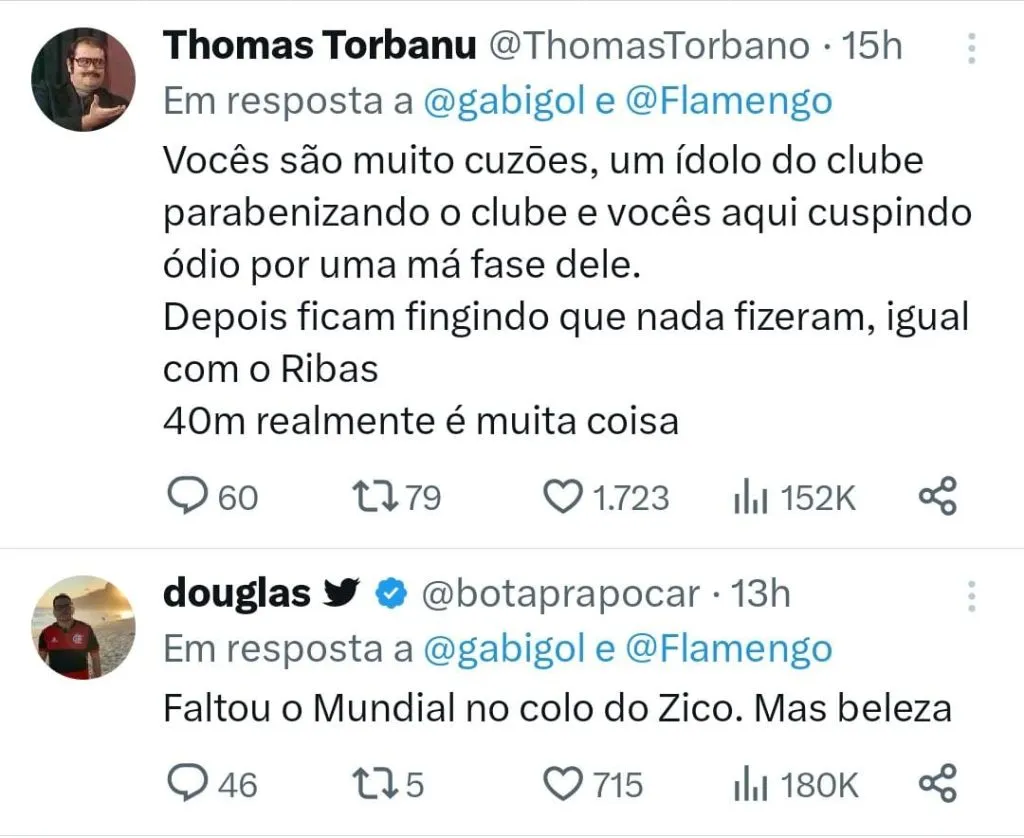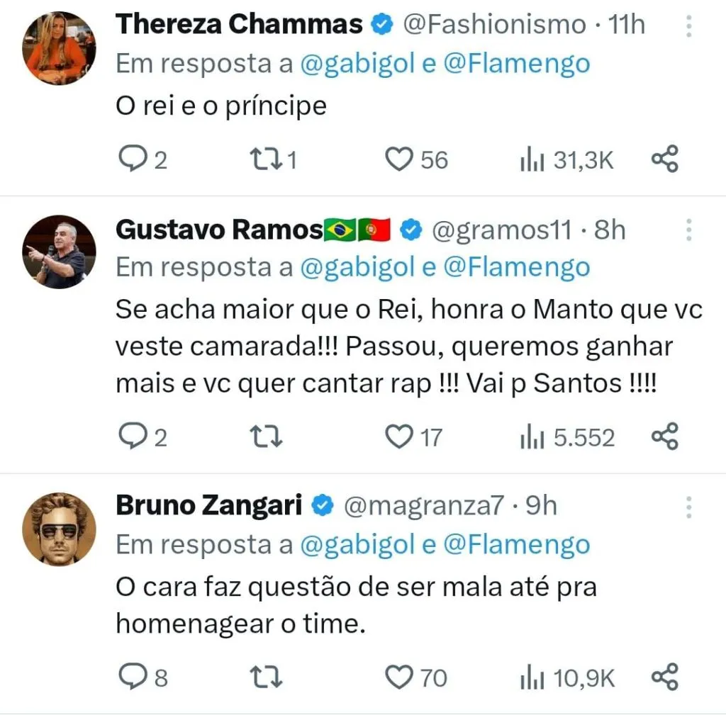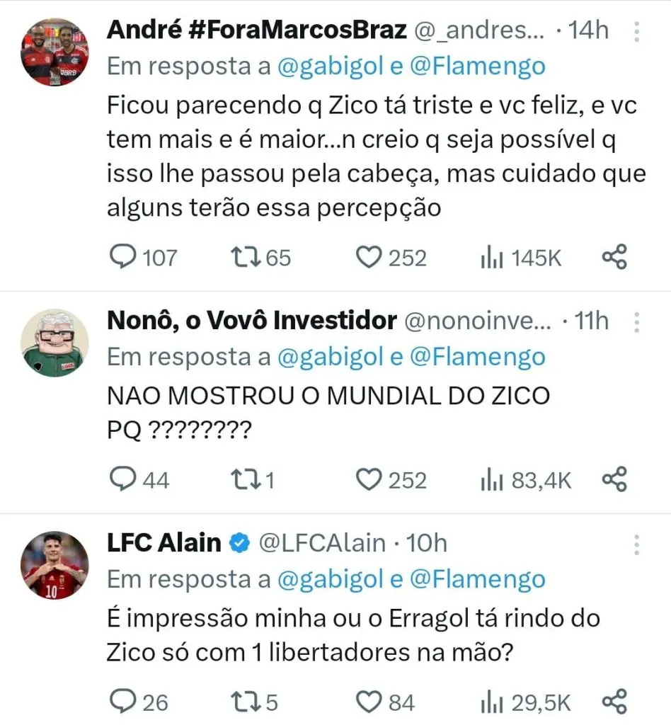 Nomes como Andrade, que atuou com Zico, não aprovaram a postagem de Gabigol. “Eu acho que foi mais uma brincadeira: que ele estava com duas da Libertadores e o Zico com uma. Mas acho que ele esqueceu que o Zico foi campeão mundial — e mesmo se não fosse, não existe comparação”, disse Andrade à ESPN.