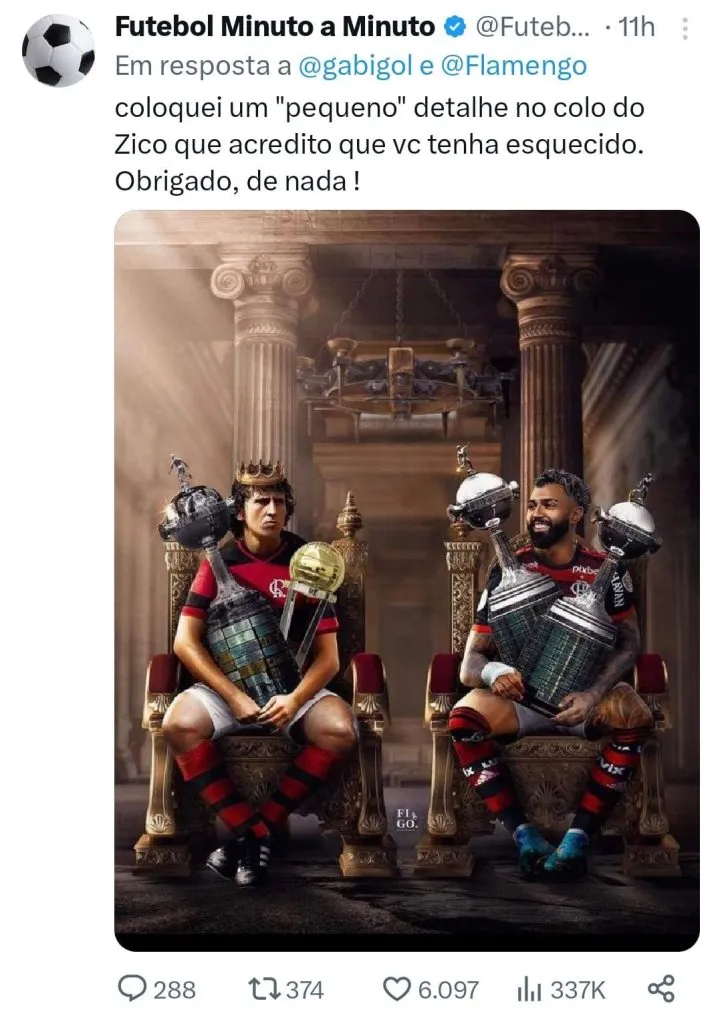 O atacante publicou uma imagem dele com duas taças da Libertadores sentado em um trono ao lado de Zico com apenas um troféu da competição continental. Na fotografia, o Galinho aparece usando uma coroa.