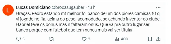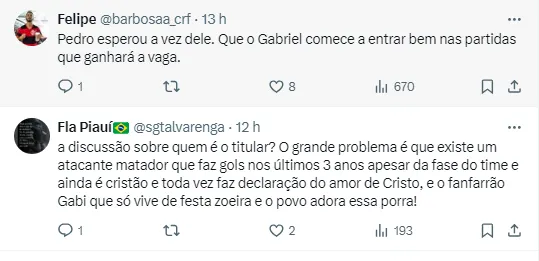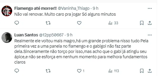 Vale lembrar que sua renovação de Gabi com o Flamengo, cujo contrato se encerra no fim do ano, está parada. Diogo Dantas ainda informou que ele ficou mais recluso depois das negociações: “Depois de o Flamengo recuar na renovação contratual, em função da alta pedida e da má fase de Gabi, o camisa 10 ficou ainda mais recluso, no aguardo de uma definição, que não veio”, disse.