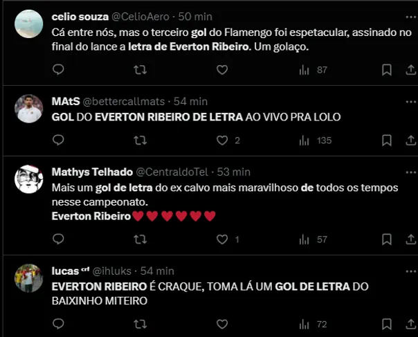 Diante do América-MG, Everton Ribeiro não iniciou entre os titulares, entrou no 2° tempo. Com apenas 25 minutos em campo, o jogador marcou um gol de letra, fato que deixou a torcida feliz.