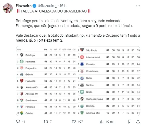 A torcida do Flamengo acompanhou os resultados do Brasileirão neste fim de semana e os tropeços antigos do Rubro-Negro vieram à tona. Com a derrota do Botafogo para o Cuiabá, a Nação lamentou o distanciamento do líder.