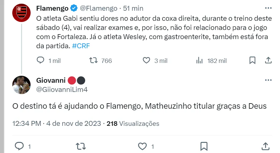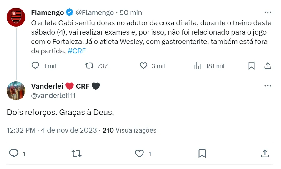No Twitter, o Flamengo informou que Gabigol sentiu dores no adutor da coxa direita e vai passar por exames. Já Wesley está com gastroenterite e, com isso, fica fora do jogo com o Fortaleza.