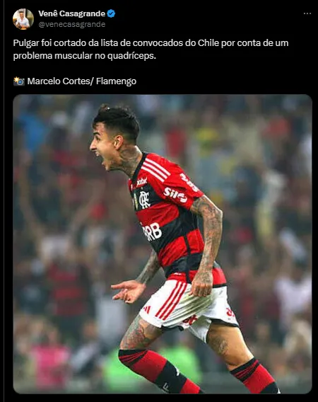 Segundo Venê Casagrande, através de postagem em suas redes sociais, o volante chileno Erick Pulgar, do Flamengo, revelou que o jogador foi desconvocado pela Seleção Chilena. A decisão foi tomada por uma lesão muscular.