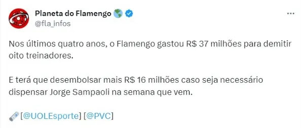 De acordo com o PVC, nos últimos quatro anos, o Flamengo gastou R$ 37 milhões para demitir oito treinadores. E terá que desembolsar mais R$ 16 milhões caso seja necessário dispensar Jorge Sampaoli na semana que vem ou antes do contrato. Vale lembrar que o argentino tem vínculo até dezembro do próximo ano.