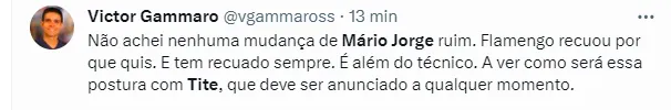 Inclusive, antes mesmo de ser comentado sobre o acerto com Tite, alguns chegaram a levantar a possibilidade do Mário ficar no comando até o fim da temporada. Pela primeira vez, o atual comandante falou sobre a possibilidade da chegada do técnico de 62 anos: “Sobre continuidade ou não e a chegada do professor Tite ou não, o Clube está tratando internamente. Minha missão é estar pronto para quando o Clube precisar”, disse.