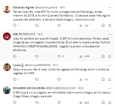 “Eu não estou, até porque não sou louco, desmerecendo o jogador Everton Ribeiro. Até porque, é um grande jogador, mas quem mudou a história e foi mágico foram: Arrascaeta, Gabigol e Bruno Henrique. Os fatos estão aí e comprovam”, finalizou o narrador.