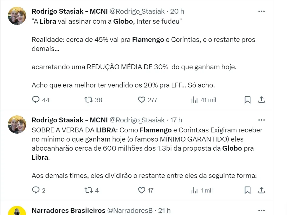 O Flamengo liderou a lista de faturamento, com R$ 275 milhões, seguido pelo Corinthians, que embolsou R$ 187 milhões da Globo. Nos bastidores, Landim foi um dos principais líderes do grupo da Libra para o fechamento do acordo.