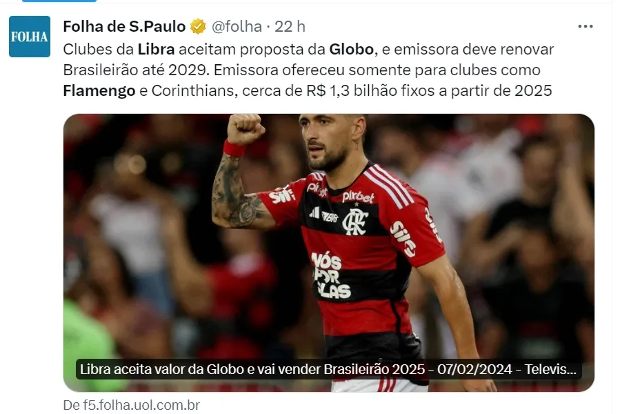 Como informou o UOL Esporte, os clubes da Libra aceitaram a proposta da Globo para a venda dos direitos de transmissão do Campeonato Brasileiro a partir de 2025 e válido até 2029. A oferta é de R$ 1,3 bilhão (mais gatilhos de pay-per-view), e a negociação agora avançará com o grupo de mídia.
