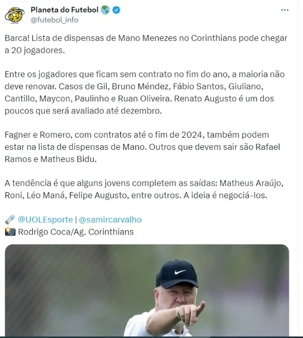 Lista de dispensas de Mano Menezes no Corinthians pode chegar a 20 jogadores de acordo com o jornalista Samir Carvalho. Entre os jogadores que ficam sem contrato no fim do ano, a maioria não deve renovar. Casos de Gil, Bruno Méndez, Fábio Santos, Giuliano, Cantillo, Maycon, Paulinho e Ruan Oliveira. Isso pode ser positivo para o Flamengo.