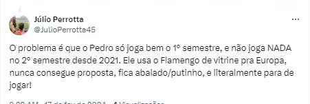 Pedro vem fazendo um bom começo de temporada com a camisa do Flamengo. O camisa 9 é o artilheiro do time com sete gols em sete jogos, entre partidas do Campeonato Carioca e amistosos que a equipe fez em 2023.