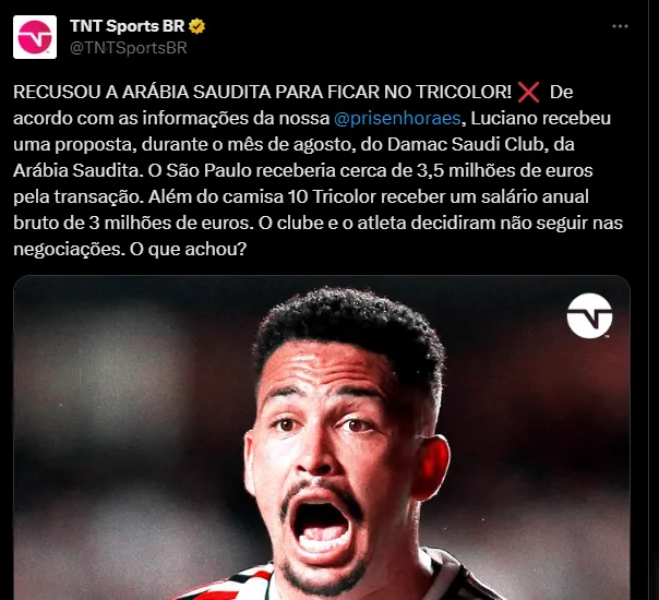 De acordo com o Lance, a proposta chegou em agosto, mas foi prontamente recusada por Luciano, que tem uma identificação com o clube do Morumbi. O desejo é principalmente pensando na decisão pela Copa do Brasil, título que seria inédito para o Tricolor.